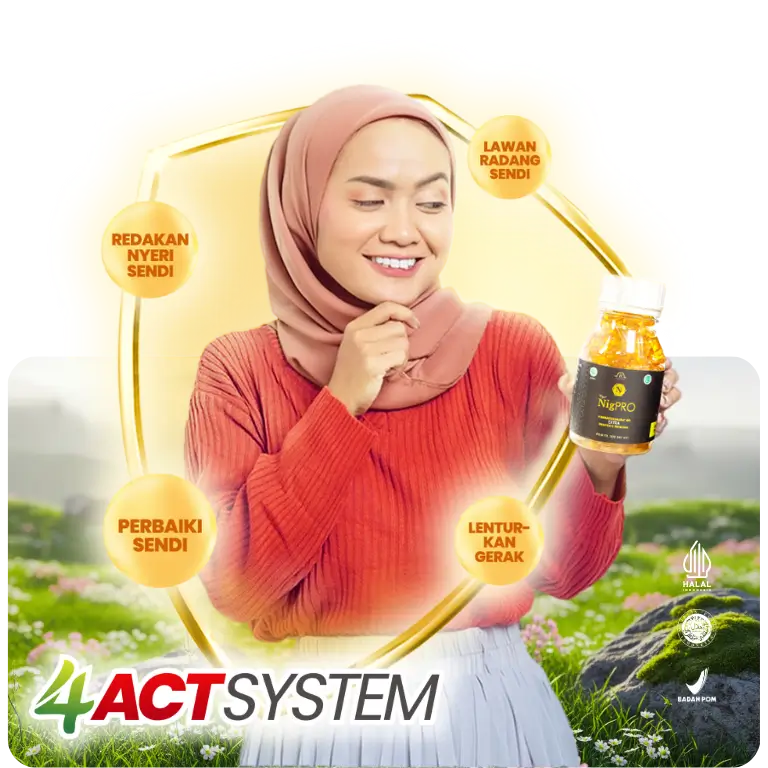 Dengan 4ACT System™, Royal Nigpro menghadirkan kombinasi 4 herbal aktif yang bekerja langsung pada sumber masalah sendi.